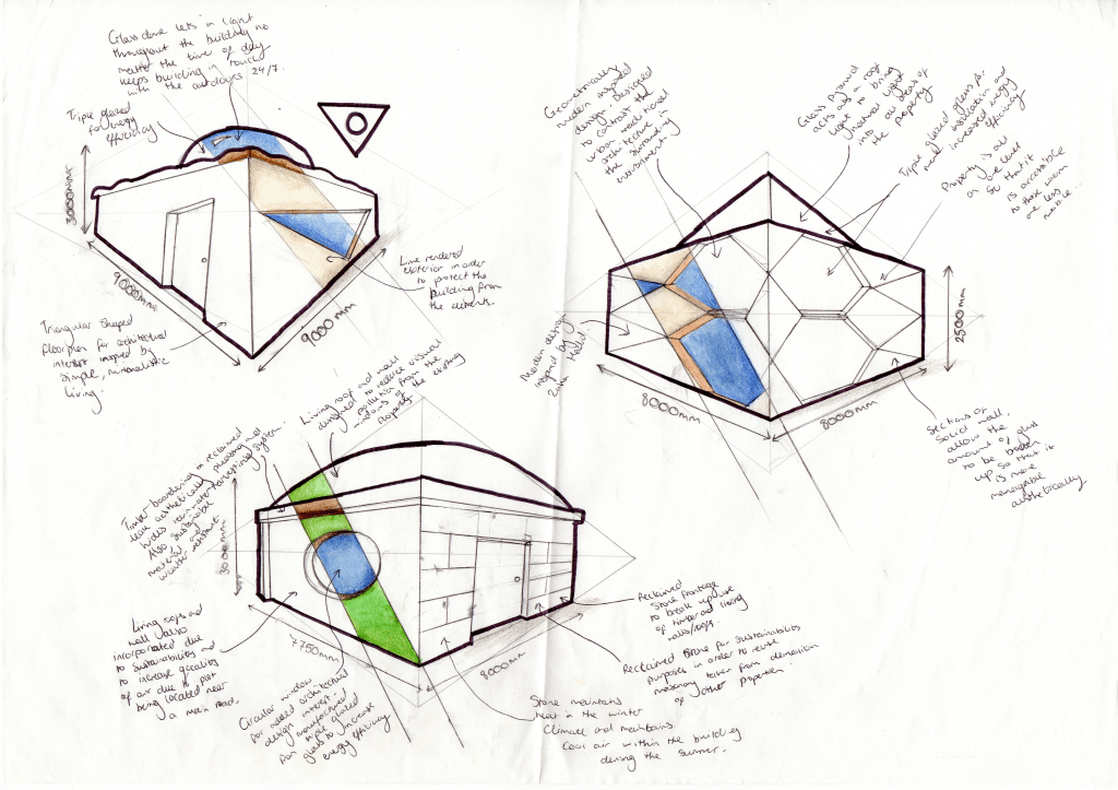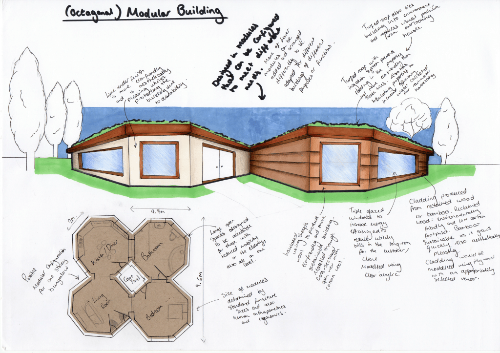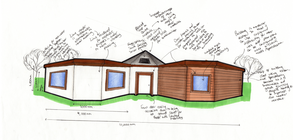 For A Level Product Design, I endeavoured to design a modular bungalow that was suitable for those with mobility limitations and disabilities. Accessibility was a focus alongside the requirements of the client. The Modular units would be pre-fabricated off site and could be arranged in multiple formations depending on the client’s needs, whilst being informed by sustainable design features.
