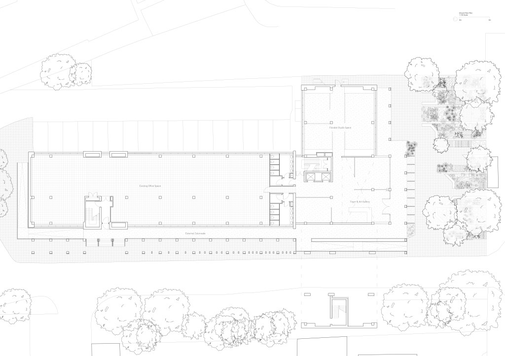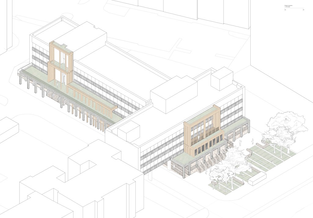 The former Teleperformance House is a vacant building located along Hagley Road, an arterial connective link between Edgbaston and Birmingham City Centre. Situated within the New Garden Square site on the Calthorpe Estate, it is earmarked for demolition. The site straddles the boundary between the Edgbaston and Ladywood Wards, offering an opportunity to activate the facade as a means of creating a new boarder, as explained by Sennett (2017) to provide a ‘new zone of active exchange’ between both communities. The former Teleperformance House building, originally built during the 1970s, was redeveloped in the late 1990s with a new curved glazed entrance façade that was unsympathetic to the existing building. The intention for this proposal is to advocate for the retention of the existing building whilst redeveloping key spaces to provide greater community exchange as well as redesigning the façade to provide a more sympathetic intervention.