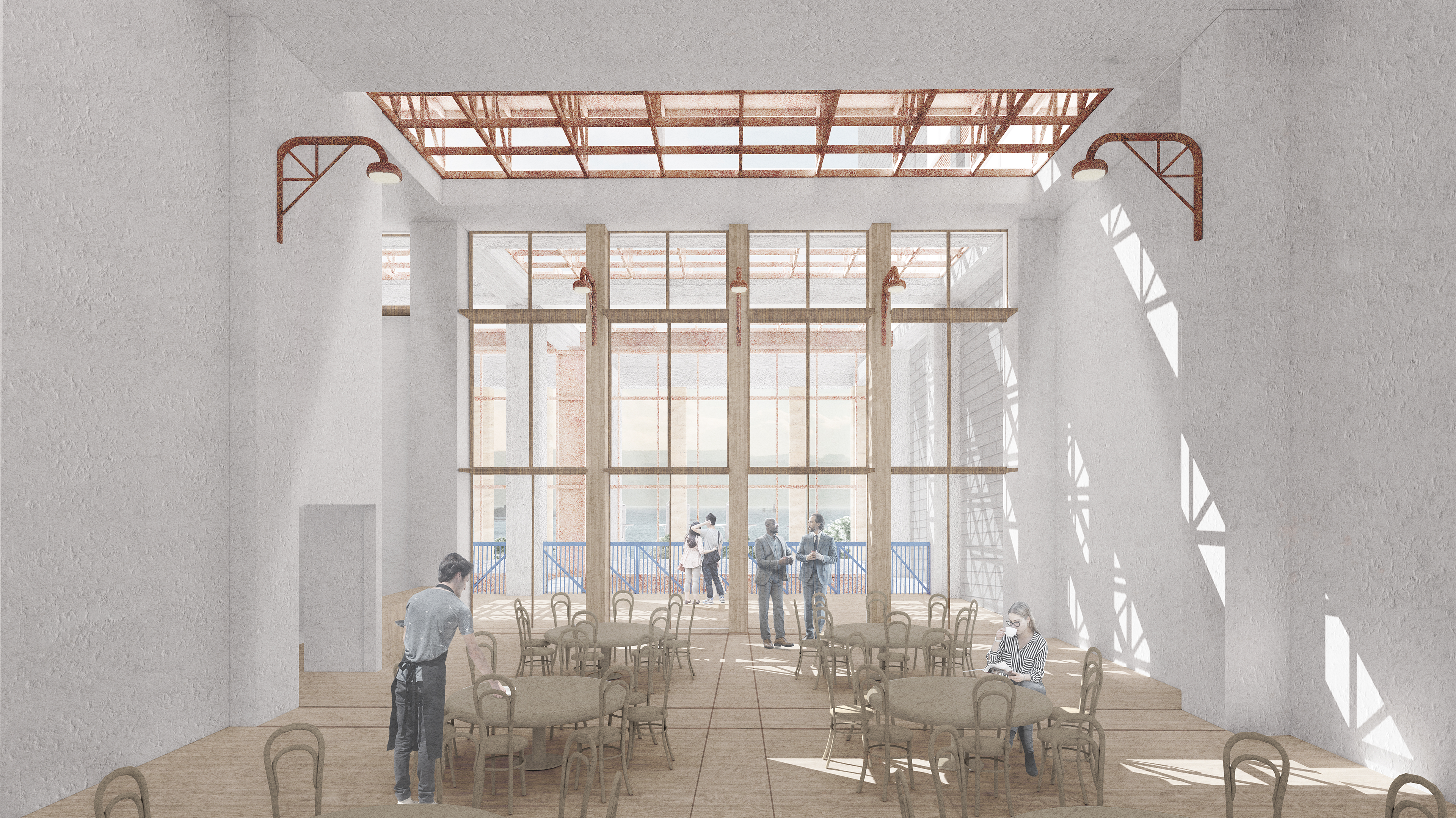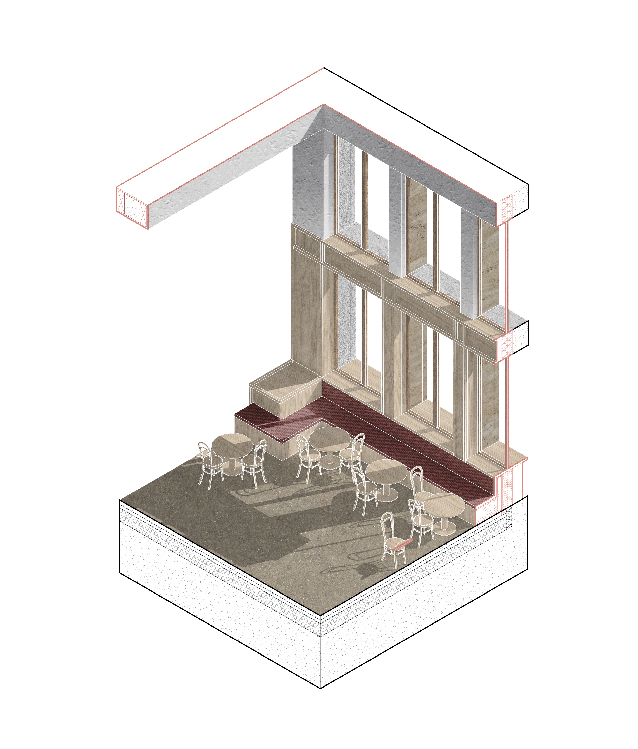 Circular economy processes were key in informing the programmatic development of the Industribønne project. By maintaining the existing concrete structural frame, this allowed for the exploration into the use spent coffee grounds as aggregate in the construction of pre-fabricated rammed earth infill elements.